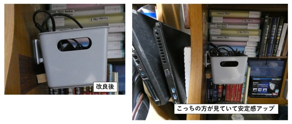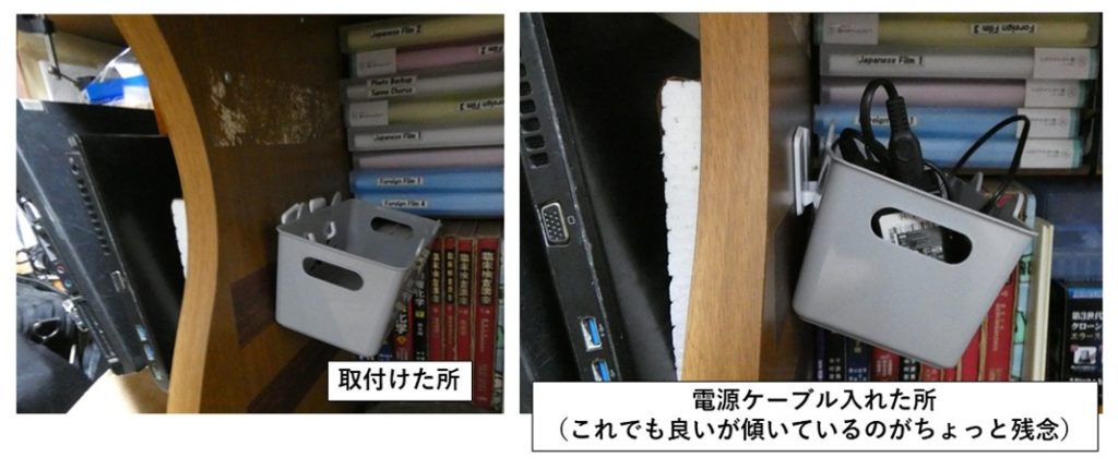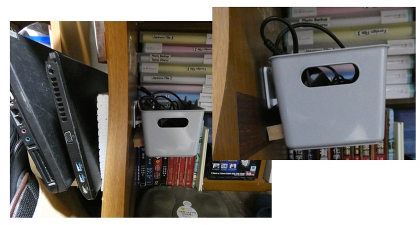 今回のDIYは100円ショップから買ったBoxとフック、トータル220円(消費税込み)。実際の作業時間、5分程度の簡単なものでした。でも、これまでノートPCの電源ケーブルの置き場に困っていたので整理整頓、スペース確保の点からかなり有効なDIYです。今の所足がBoxにぶつかるような不具合も全く起きていませんし、粘着テープの強度が弱くてBoxが落ちるような事も生じていません。