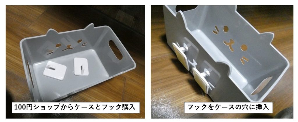電源ケーブルを入れる容器は100円ショップから購入したBox。それを粘着テープで固定するタイプのフックで側板に固定する事としました。ケースは自分で穴をあけるのは面倒なので、真ん中付近にフックを通す穴、2ヶ所開いているBoxを選びました。