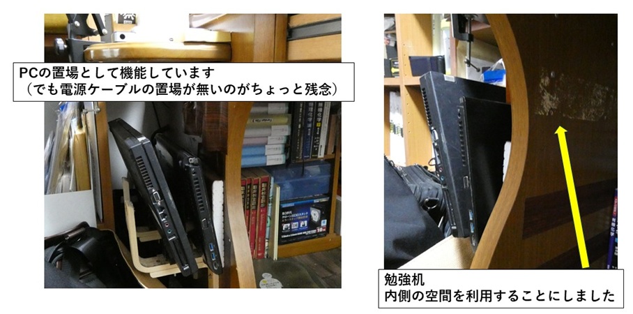 「勉強机のリノベーション奮闘記(その2)」にて、勉強机の横にノートPCの置場を作りました。これは結構重宝しています。特に省スペース化への寄与が大きいです。