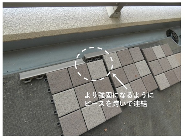バルコニータイルの一番外側は、風で煽られないようにピースを接続しています。そしてバルコニータイルがより強固になるようにこのピースはわざとバルコニータイルを跨いで連結してました。ところが、いざ剥がすとなるとこれが大変。バルコニータイルはコツをつかめばさほど難なく剥がれるのですが、このピースを外すのが大変です。仕方ないから外すのが大変なピースはバルコニータイル数枚そのままで保持しました。