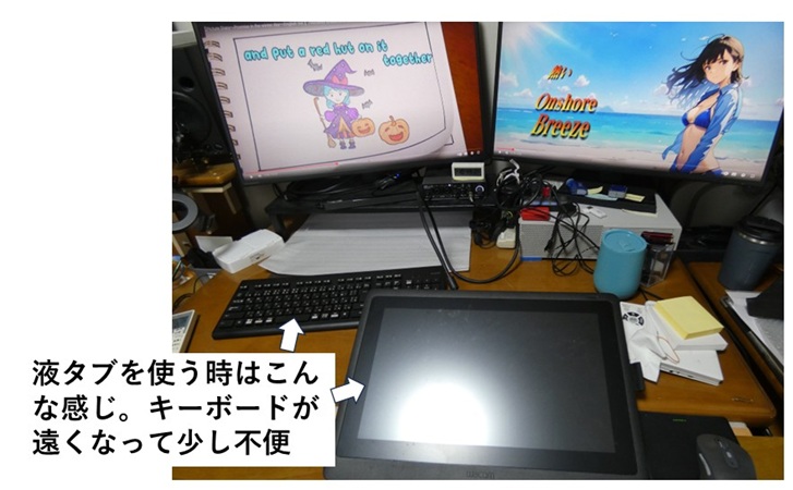 液タブを使う時は机の上を一旦片付けて、キーボードの位置を変えて下の写真のようにして使用しています。机の上の作業範囲が広くて液晶タブレットを十分に使えるのは良いのですが、キーボードが遠くなってちょっと不便。