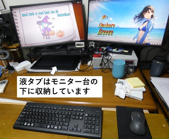 YouTubeに投稿している曲の動画中に差し込んでいるイラストは、私が液晶タブレット(液タブ)で描画しているのですが、液タブは下の写真のようにモニター台の下に普段は収納しております。