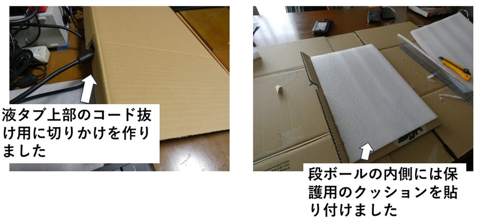 いくら段ボールでもすれると液晶表面に微細な傷を付けかねないので、その内側には保護用のクッションを貼り付けました。貼り付けにはまたもやいつもの両面テープが活躍です。保護用のクッションは電化製品を購入した時に梱包していたものを将来、何かの機会に使うかもしれないと思い取ってあったものが有効利用できました。