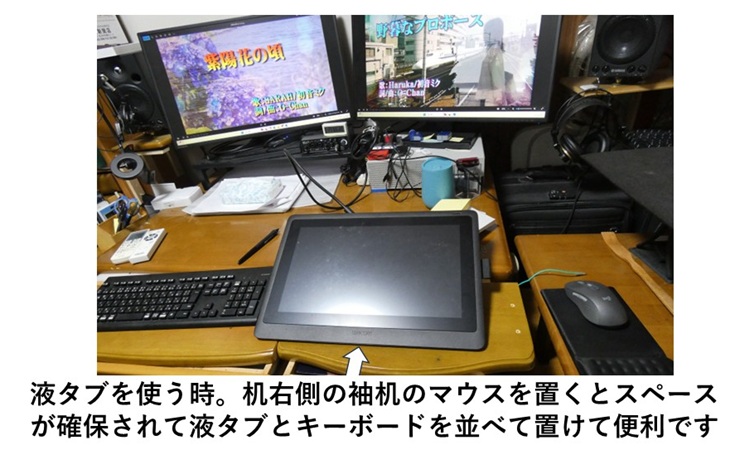 液タブを使う時の最終的な現在のレイアウトが下の写真です。液タブを使う時は拡張した手前側のスペースに少し引き出し、マウスは袖机の上に移動としました。これで机の上のスペースが確保されて液タブとキーボードを並べて置けて便利です。