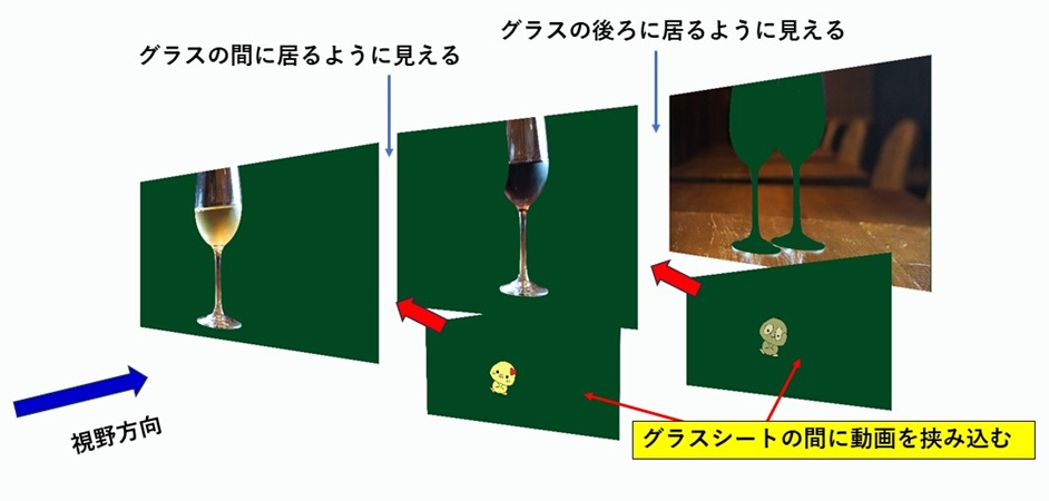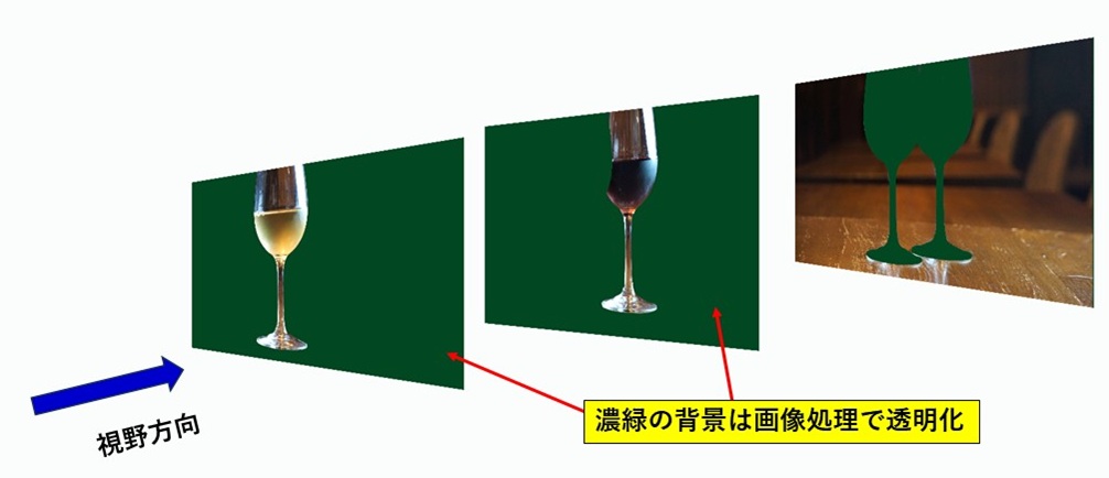 作成した3つの画像を視野方向から①手前グラス ②奥側グラス ③両方のグラスを消去した背景画像 の順で重ねます。濃緑の部分は画像処理で透明化しますので、視野方向からはOriginalの写真と一緒に見えますが、実際は3枚の写真が縦方向に重なっている画像となります。