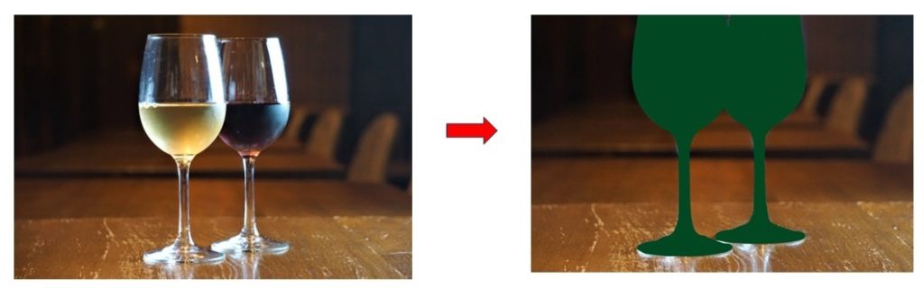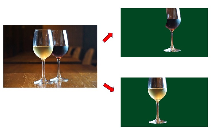 実はもうひとつ、これは実際に作業をしてから気付いたことなのですが、両方のグラスを消去した背景のみの画像も作成しなければいけませんでした。ここでは上の写真とは反対に消したグラス部分を濃緑色にしました。