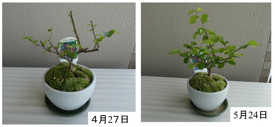 この春からの睡蓮木の一連の写真を下に示します。まずは4月末~5月末。届いた頃は葉はほとんどありませんでしたが、日を追うごとに葉が多く出てきました。春は順調に過ごせたようです。