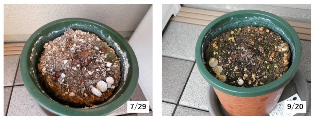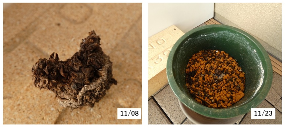 今年は夏が厚く長かったのでそのままにしておきましたが、11月になっても一向に芽を吹き出す気配が無いので、土を入れ替えました。一応、球根らしき?ものがそうなのかと思いましたが、これでは多分きついですね。植え替えても芽は出しませんでした。